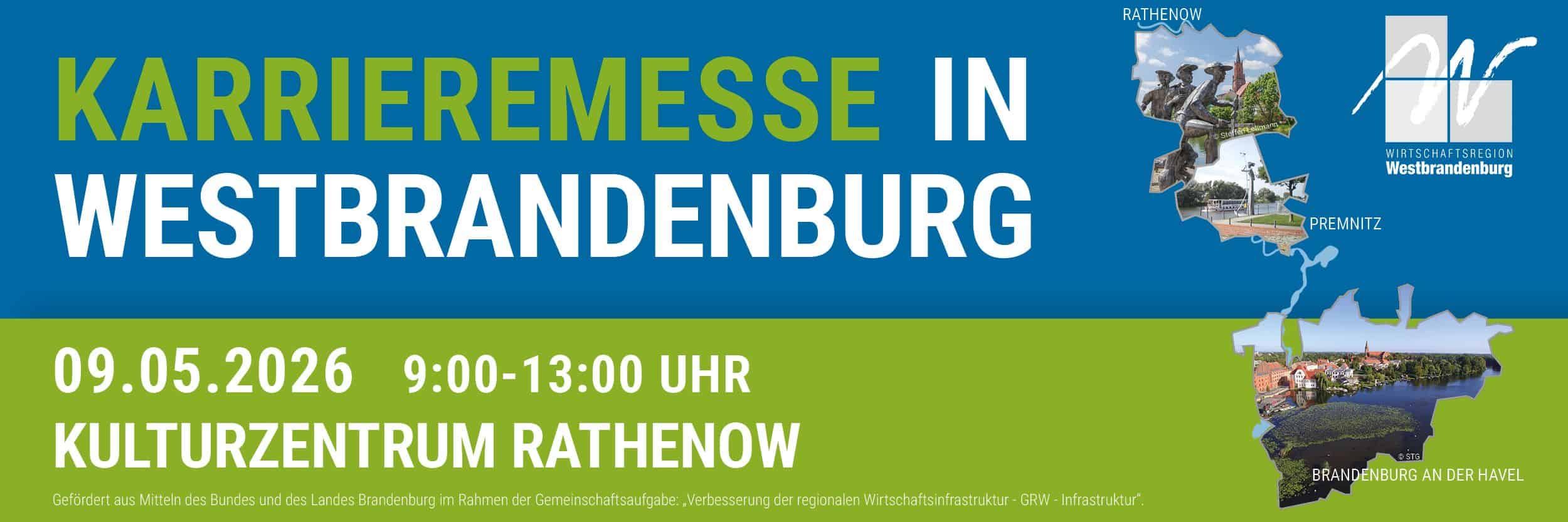 Die Wirtschaftsregion Westbrandenburg bietet vielfältige berufliche Perspektiven – und genau diese stehen im Mittelpunkt der Karrieremesse Westbrandenburg. Unternehmen aus nahezu allen Branchen präsentieren hier ihre offenen Stellen, Karrierewege und Entwicklungsmöglichkeiten und kommen direkt mit qualifizierten Arbeits- und Fachkräften ins Gespräch. Die Messe richtet sich an Unternehmen, die motivierte Mitarbeitende suchen. Gleichzeitig bietet sie Jobsuchenden, Fachkräften, Berufseinsteigern, Pendlern, Rückkehrern, Zuzüglern und ausländischen Arbeitskräften die Chance, die berufliche Vielfalt der Region kennenzulernen und einen neuen Job zu finden.