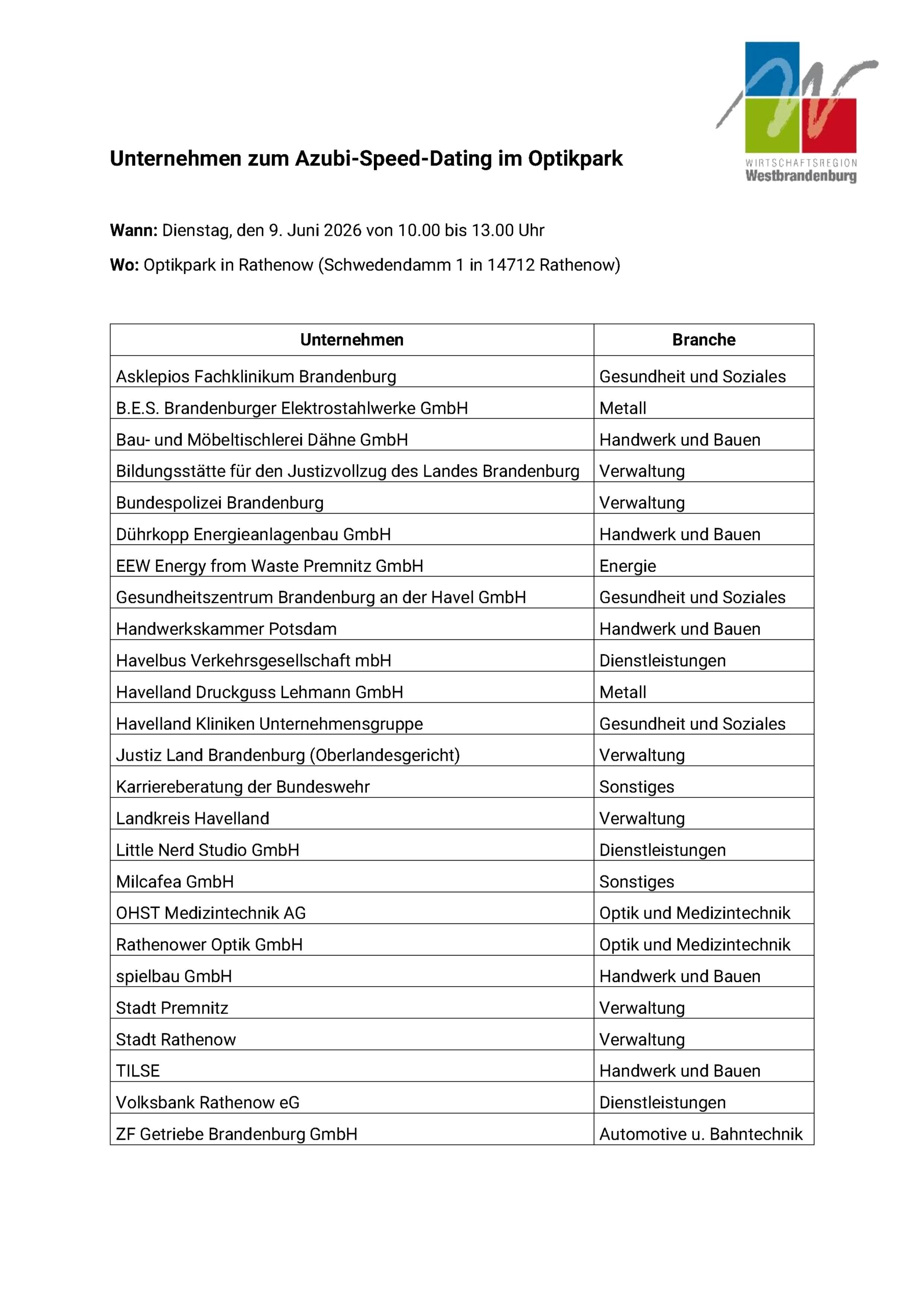 Hast du Lust auf eine Ausbildung, die wirklich zu dir passt – ohne den Stress von komplizierten Anschreiben und langen Wartezeiten? Dann komm vorbei und triff engagierte Unternehmen aus Rathenow, Premnitz und dem Westhavelland! Am 9. Juni 2026 verwandelt sich der Optikpark Rathenow in deine Job-Bühne. Hier sparst du dir das Verschicken unzähliger Bewerbungen und punktest direkt mit deiner Sympathie. Im besten Fall gehst du schon mit einem Ausbildungsvertrag in der Tasche nach Hause!